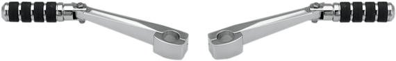 Caracteristicas: 13" long CNC-machined billet aluminum pegs Adjust 8" forward and back to accommodate any leg length or riding position Anti-vibration pegs feature 3/8" mounting bolts and unique locking setscrew system that lets riders set the peg angle to their comfort level No-rust stainless steel hardware Made in the U.S.A.