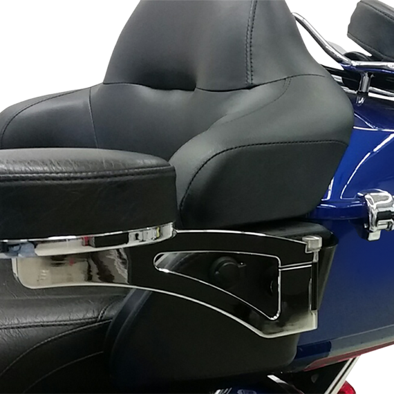 Caracteristicas: CNC-machined from solid billet aluminum, hand-polished to a flawless finish and triple-chrome plated Fitted with comfortable padded, upholstered cushions Arms pivot outward to allow easy passenger access Adjustable width for maximum passenger comfort Sturdy black powder-coated steel backing plates offer secure, rigid mounting Includes mounting bracket to accept most cup holders and instructions for easy installation Made in the U.S.A.