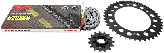 Caracteristicas: Kits includes a premium Driven® C45 steel alloy black case hardened rear sprocket paired with Driven® C45 steel case hardened and quenched front sprocket RK’s 520 Steel Quick Acceleration Race Kit combines the enhanced performance of race gearing and durability of steel components Kit includes a one-tooth-smaller-than-OE front sprocket
