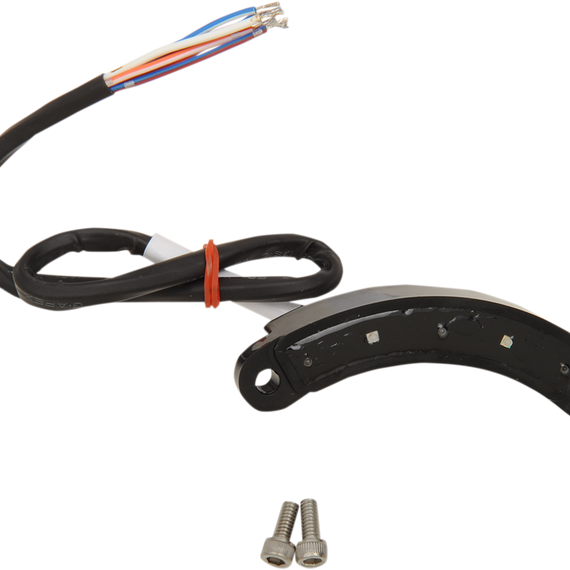 Caracteristicas: Optional component for RSD Café Gauge & Headlight Re-locator ONLY (not compatible with OEM gauge mount) Allows all OEM warning & indicator functions (Outer Green: L&R Turn indicators, Red: Oil Pressure, Blue: High Beam & Center Green: Neutral) 5 L.E.D. lights in one arc-shaped weather-proof unit 12” long wiring lead Wire insulation color matched to OEM wiring for ease of installation Wires must be soldered and heat shrunk to OEM harness