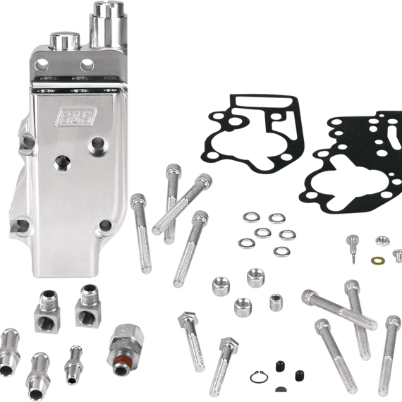 Caracteristicas: Kit includes oil pump, universal cover with top and bottom feeds, mounting bolts, supply and return gears, drive shaft with keys and snap rings, check ball and spring, pressure relief valve and spring, check ball and release valve cover screws with O-rings, miscellaneous hose fittings, plugs, screws and gaskets Pump features a smoother design and pressure relief towers that are .300" shorter than the OEM oil pump Accepts 3/8" rubber oil lines Replacement gaskets available separately Made in the U.S.A.