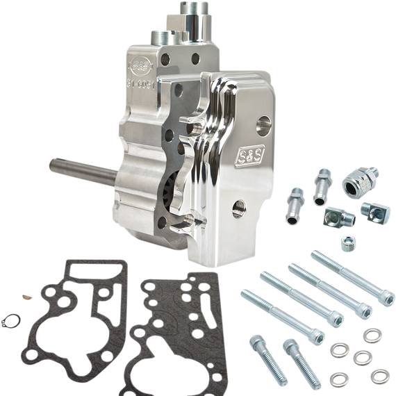 Caracteristicas: Kit includes an oil pump with cover, mounting bolts, supply and return gears, drive shaft with keys and snap rings, check ball and spring, pressure relief valve and spring, check ball and release valve cover screws with O-rings, miscellaneous hose fittings, plugs, screws and gaskets Pump features a smoother design and pressure relief towers that are .300" shorter than the OEM oil pump Accepts OEM steel oil lines and have late-style mounting bolt pattern Replacement gaskets available separately Made in the U.S.A.