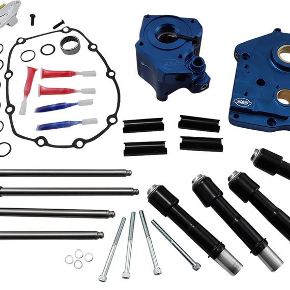 Caracteristicas: Precision Machined from Billet Aluminum Blue Anodized Finish Passage Plugs Removable for servicing Independent Scavenge Sections for Flywheel Cavity and Cam Chest Debris Screens in both scavenge pickups Magnet in Cam Chest to help to stop debris from entering oil pump Increased Flow Capacity on both Feed and Scavenge side Adjustable Pressure Relief Valve is adjustable with unit installed in engine Quickee Pushrods S&S Precision Tappets Hard Anodized Black Coating Billet Aluminum Construction Stronger than Stock Material eliminates Distortion Improve tappet stability in high lift and high rpm situations 465 is a Torque Cam, perfect for Touring applications Includes all gaskets, bearings, and hardware required for installation Made in USA