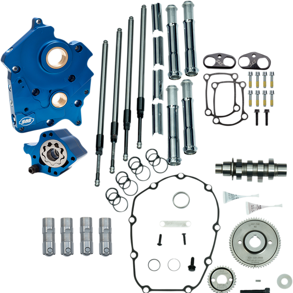 Caracteristicas: Precision Machined from Billet Aluminum Blue Anodized Finish Passage Plugs Removable for servicing Independent Scavenge Sections for Flywheel Cavity and Cam Chest Debris Screens in both scavenge pickups Magnet in Cam Chest to help to stop debris from entering oil pump Increased Flow Capacity on both Feed and Scavenge side Adjustable Pressure Relief Valve is adjustable with unit installed in engine Quickee Pushrods S&S Precision Tappets Hard Anodized Black Coating Billet Aluminum Construction Stronger than Stock Material eliminates Distortion Improve tappet stability in high lift and high rpm situations 465 is a Torque Cam, perfect for Touring applications Includes all gaskets, bearings, and hardware required for installation Made in USA