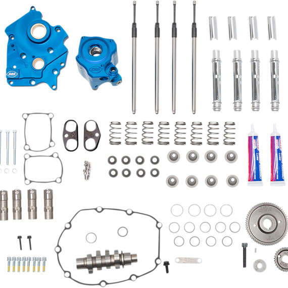 Caracteristicas: Precision Machined from Billet Aluminum Blue Anodized Finish Passage Plugs Removable for servicing Independent Scavenge Sections for Flywheel Cavity and Cam Chest Debris Screens in both scavenge pickups Magnet in Cam Chest to help to stop debris from entering oil pump Increased Flow Capacity on both Feed and Scavenge side Adjustable Pressure Relief Valve is adjustable with unit installed in engine Quickee Pushrods S&S Premium Tappets Hard Anodized Black Coating Stronger than Stock Material eliminates Distortion Improve tappet stability in high lift and high rpm situations S&S 550 Cam- Designed for Big Bore Applications Chain Drive High Performance Conical Single Wire Spring Includes: Springs, Top Collars, Keepers, Valve Seal/Bottom Collar Works with cams up to .605 lift Includes all gaskets, bearings, and hardware required for installation Made in U.S.A.