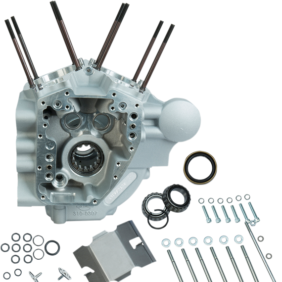 Caracteristicas: Stock or 4-1/8" bore crankcases to be used as a foundation for a custom engine or replacement for T111, T124, or T143 Stock looking, but stronger; thicker wall sections and superior 356-T6 aircraft grade aluminum Tough powder coat finishes Reinforced front motor mount for extra strength Timken® sprocket shaft bearing – Strong enough for the most demanding applications Clearanced for strokes up to 4-3/16" and cams up to .720" lift Includes pinion and Timken® bearing Manufacturer's Statement of Origin (MSO) included Includes studs and cam bearings installed Crankcases are specially machined for the new S&S oil line installation kits sold separately Made in the U.S.A. Requires Oil supply line installation kit PART #s 0950-0848 or 0950-0849.