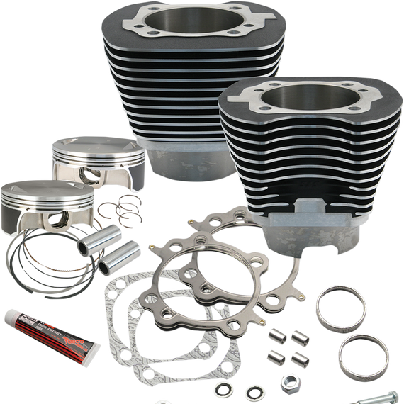 Caracteristicas: The Big Bore kit yields excellent results with stock cylinder heads Easy installation: no need to bore or split existing cases, just swap the cylinders Cylinders are constructed from premium aluminum castings with cast-in iron liners Kits include cylinders, pistons, rings and gaskets (head, base and exhaust) Black or silver powder-coat finish Made in the U.S.A. This project requires a skilled technician. It is the responsibility of the person assembling the parts to check all clearances and assembly specifications.