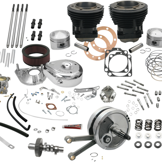 Caracteristicas: Kits come with 4-1/2" stroker flywheels assembled with mainshafts and rods, 3.625" bore cylinders, pistons, rings, pins and clips, S&S 514 cam, S&S Super E carb kit, valve springs, adjustable chromoly pushrods, top pushrod tube clips, top motor mount and installation instructions Use stock heads, cases, tappets and pinion gears Bearings and seals are not included; must be purchased separately Made in the U.S.A. Require motor cases to be bored to accept 3.625" cylinders. This project requires a skilled technician. It is the responsibility of the person assembling the parts to check all clearances and assembly specifications.