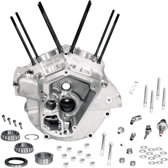 Caracteristicas: Cast from A356 T-6 heat-treated aluminum alloy Machined to accept an oil filter assembly that mounts on the front of stock motor cases All races are line-honed and breather cavity is precision-machined to optimize breather timing for maximum oil scavenging Additional parts include; crankcase bolts, washers and nuts, cylinder mounting studs, timing hole plug, magnetic drain plug, assorted breather and oil line fittings, oil pressure switch, oil screen, spring and plug, sprocket shaft Timken® bearing assembly and oil seal, pinion shaft main bearing race, cam needle bearing assembly, oil pump drive shaft bushing and installation instructions Machined for EFI fitment Made in the U.S.A.