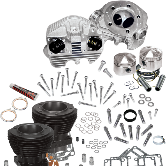 Caracteristicas: Include a set of S&S Shovelhead-style cylinder heads, a pair of S&S stock bore cylinders (3-7/16" for 74" engines or 3-1/2" for 80"), forged 8:1 compression pistons complete with rings and wrist pins, manifold clamps, manifold seals, all required hardware, and gaskets Pistons are pre-fit to the cylinders, so there is no machine work to be done and very little down time Made in the U.S.A.