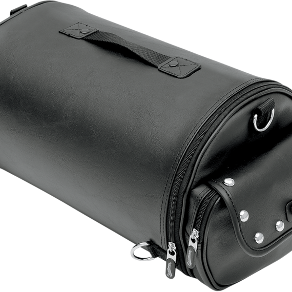 Caracteristicas: Rigid construction provides rider support and can be leaned back on when mounted on backseat Multiple exterior pockets Constructed of UV-resistant leather-grain composite Comes with ½" chrome studs Dimensions: 14" W x 8½" H x 8½" D