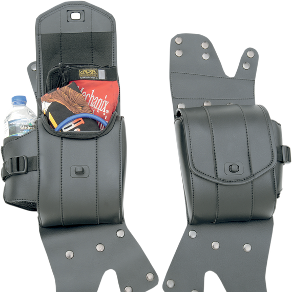 Caracteristicas: Rugged storage bags bring style and convenience to any Harley-Davidson® bagger running FLHT-style saddlebag guards Leather-grained UV and weather-resistant 3mm thick SaddleHyde™ bags have spacious inner compartments and fold-away mesh beverage holders Includes right and left organizer Rigid construction bags hold their shape even when empty, quarter-turn flap releases accept mini-padlocks so you can secure your belongings in the bags Your personal cargo stays clean and dry as each compartment's zippered opening is further protected by weather-stopping flaps Mounting is a snap! No tools required as each bag snaps tight to saddlebag guards with non-slip pads Measures: 7-1/2" L x 4-1/2" W x 15" H