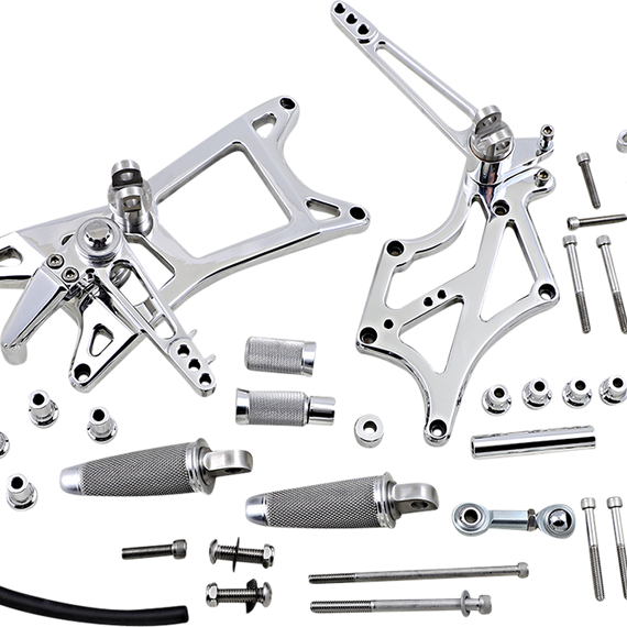 Caracteristicas: Complete bolt-on mid controls for the more aggressive rider. More ground clearance for the performance minded. No more dragging floorboards in the corners. Easy bolt-on design. Though it will require some minor modifications. Requires new brake line and relocation of the brake light switch. Note: These will not work with OEM exhausts, or some aftermarket exhaust. It will require a custom or specific after marker exhaust system Made in California
