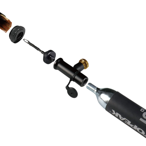 Caracteristicas: Dual-function tubeless tire repair and inflation solution Works as a one-step repair and inflation tool through the tire hole or through the tire valve Includes inflator adaptor with air regulator, CO2 Cartridge, Tire reamer, storage compartment with repair plugs Attaches to seatpost or frame tube with mounting module and grip strap