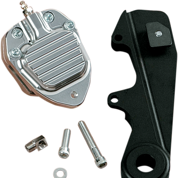 Caracteristicas: Raw metal on black contrast calipers is anodized for a long-lasting high-quality finish Two piston designs for various H-D models (including rigid frames) Hanger brackets and brake pads included For use with 11.5" rotors Made in the U.S.A. The OLD-STYLE Wagner and Kelsey-Hayes (die-cast aluminum OEM) on rear applications have a 3/4" bore master cylinder and WILL NOT WORK CORRECTLY. Not recommended for use with imported stainless steel rotors. Requires use of 5/8" bore master cylinder.