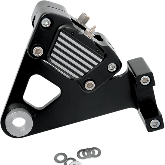 Caracteristicas: Raw metal on black contrast calipers is anodized for a long-lasting high-quality finish Two piston designs for various H-D models (including rigid frames) Hanger brackets and brake pads included For use with 11.5" rotors Made in the U.S.A. The OLD-STYLE Wagner and Kelsey-Hayes (die-cast aluminum OEM) on rear applications have a 3/4" bore master cylinder and WILL NOT WORK CORRECTLY. Not recommended for use with imported stainless steel rotors. Requires use of 5/8" bore master cylinder.