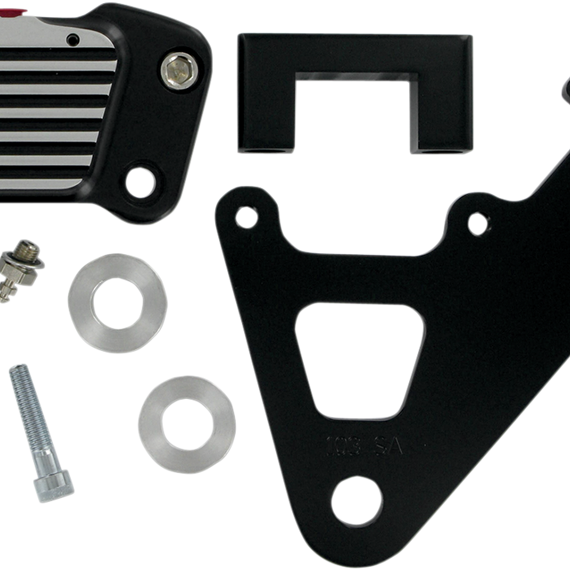 Caracteristicas: Raw metal on black contrast calipers is anodized for a long-lasting high-quality finish Two piston designs for various H-D models (including rigid frames) Hanger brackets and brake pads included For use with 11.5" rotors Made in the U.S.A. The OLD-STYLE Wagner and Kelsey-Hayes (die-cast aluminum OEM) on rear applications have a 3/4" bore master cylinder and WILL NOT WORK CORRECTLY. Not recommended for use with imported stainless steel rotors. Requires use of 5/8" bore master cylinder.