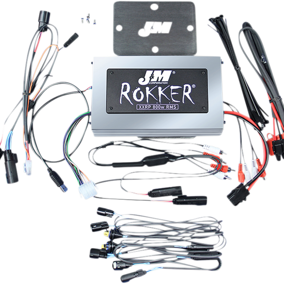 Caracteristicas: Kit includes a full range class D audio amplifier, spec'd at 200 watts RMS per channel X4, (800w total) into 2-ohm load @ 14.4vdc, with dimensions of 8 1/4” Long X 5 1/8” Wide X 1 5/8” Tall Amplifier mounts to the custom made stainless steel 2-piece bracket system, to provide solid and secure mounting inside the fairing The 800w ROKKER XXR amplifier has been dialed in for this specific 4-speaker configuration, to provide maximum highway performance. (Updated amplifier gain/frequency settings as of 12-01/2019) Custom made plug-n-play green-band wiring harnesses are included, along with heavy gauge power/ground wires for the fused battery connection and all necessary mounting hardware J&M's ROKKER XXR series 6.71" speakers have been designed as exact size component/replacements for the stock 6.5" Harley fairing & rear-pod speakers as installed on the 2014-2019 Harley Ultras Spec'd at 2 ohms impedance and 300 watts maximum input (200w RMS - 91db sensitivity), speakers provide the ultimate in raw audio power and include the new custom grills with built-in high-output tweeters They feature a lightweight waterproof one-piece woven-fiber driver cone with super-rigid metal basket design High-density lite-weight Neodymium magnet structure, specially coated to maintain flux-strength integrity even at extreme operating temperatures High efficiency vented voice-coil for improved cooling when operating at high volume levels for extended periods This ROKKER XXR EXTREME custom installation KIT has been engineered to be 100% plug-and-play to maintain the integrity of your Harley's internal wiring harness, it is tuned for the Stock-Harley-Radio-Flash and includes a complete installation/operation instruction manuals Special flash needed