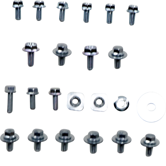 Caracteristicas: Bolt kits for body plastics designed specifically for Suzuki Includes bolts for front and rear fenders, fork guards, front number plates, seats, side panels and radiator shrouds