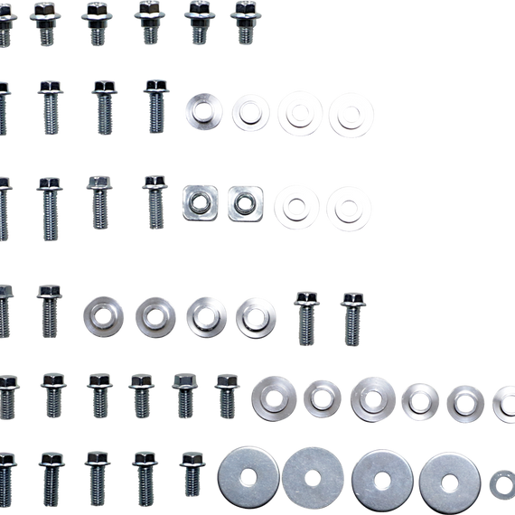 Caracteristicas: Bolt kits for body plastics designed specifically for Suzuki Includes bolts for front and rear fenders, fork guards, front number plates, seats, side panels and radiator shrouds