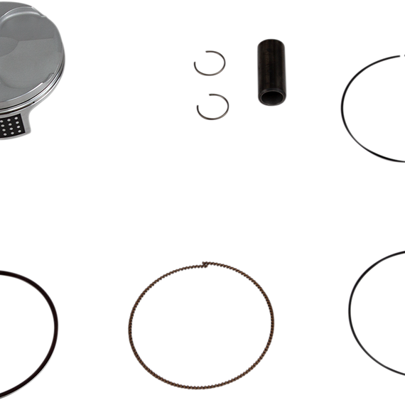 Caracteristicas: All pistons are heat treated with a T-5 hardening and tempering cycle All piston skirts are coated with a high-tech Molybdenum Disulphite coating for faster break-in time and increased piston life Cast piston kits are gravity cast aluminum alloy (not forged) with 18% silicone content, which produces an extremely light but very strong piston Forged pistons are forged from 2618 aluminum for superior strength and durability Forged High Compression pistons improve power and torque across entire rpm range Big Bore pistons increase engineƒ??s displacement, torque, and peak horsepower Forged Replica pistons are forged OE replacements Replica pistons and all rings are OEM replacements Kit include piston, rings, wrist pin and circlips