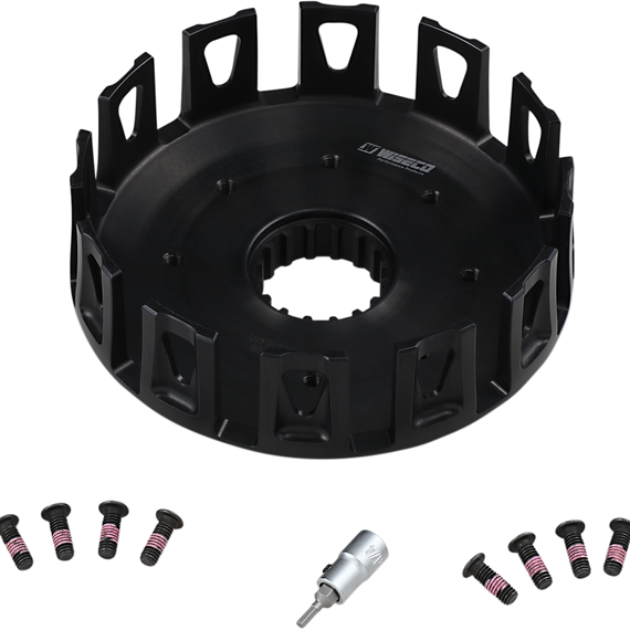Caracteristicas: Forged from lightweight aerospace-grade aluminum alloy; CNC machining ensures each clutch basket is identical to the next Weight-saving relief cuts on outside of clutch reduce rotational mass, allowing engine to rev quicker Large oiling holes increase lubrication and reduce heat buildup PTFE coating makes for a near-frictionless surface Come with fasteners complete with pre-applied thread locker