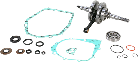 Caracteristicas: Include crankshaft, top end bearing, premium main bearings and a complete bottom end gasket set that includes all seals and gaskets needed to do the job Only one part number to stock and order Crankshafts are factory assembled and precision trued to OEM specifications Double-forged Wiseco connecting rods maintain superior dimensional consistency through improved grain flow Shot-peening eliminates residual stresses and smoothly blends the rod forging surfaces Corrosion-resistant surface treatment Top and bottom end rod bores case hardened to 58-62 RC to optimize bearing running surface Crank pin bearing radial running clearance is optimized to ensure maximum performance Precision honing ensures ultra round bearing surface Precision engineered oiling slots maximize rod strength and bearing life Double-drilled small ends provide the piston pin with extra lubrication and cooling, reducing distortion of top end due to thermal transfer from the piston Silver-coated bronze phosphor thrust washers, with dimpled design to increase oil retention and reduce friction between rod and washer interface Crank pin bearings are manufactured from the highest quality hot rolled steel; case-hardened to 58-62 RC Caged needle roller bearings provide the highest possible rpm Precision machined crank webs