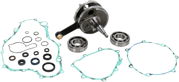 Caracteristicas: Include crankshaft, top end bearing, premium main bearings and a complete bottom end gasket set that includes all seals and gaskets needed to do the job Only one part number to stock and order Crankshafts are factory assembled and precision trued to OEM specifications Double-forged Wiseco connecting rods maintain superior dimensional consistency through improved grain flow Shot-peening eliminates residual stresses and smoothly blends the rod forging surfaces Corrosion-resistant surface treatment Top and bottom end rod bores case hardened to 58-62 RC to optimize bearing running surface Crank pin bearing radial running clearance is optimized to ensure maximum performance Precision honing ensures ultra round bearing surface Precision engineered oiling slots maximize rod strength and bearing life Double-drilled small ends provide the piston pin with extra lubrication and cooling, reducing distortion of top end due to thermal transfer from the piston Silver-coated bronze phosphor thrust washers, with dimpled design to increase oil retention and reduce friction between rod and washer interface Crank pin bearings are manufactured from the highest quality hot rolled steel; case-hardened to 58-62 RC Caged needle roller bearings provide the highest possible rpm Precision machined crank webs