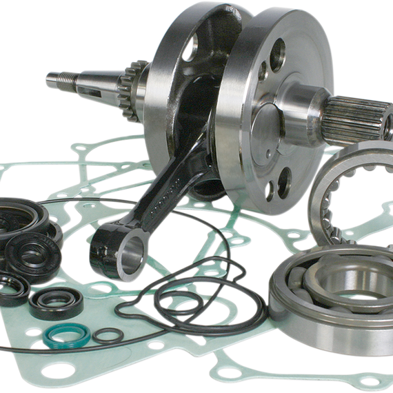 Caracteristicas: Include crankshaft, top end bearing, premium main bearings and a complete bottom end gasket set that includes all seals and gaskets needed to do the job Only one part number to stock and order Crankshafts are factory assembled and precision trued to OEM specifications Double-forged Wiseco connecting rods maintain superior dimensional consistency through improved grain flow Shot-peening eliminates residual stresses and smoothly blends the rod forging surfaces Corrosion-resistant surface treatment Top and bottom end rod bores case hardened to 58-62 RC to optimize bearing running surface Crank pin bearing radial running clearance is optimized to ensure maximum performance Precision honing ensures ultra round bearing surface Precision engineered oiling slots maximize rod strength and bearing life Double-drilled small ends provide the piston pin with extra lubrication and cooling, reducing distortion of top end due to thermal transfer from the piston Silver-coated bronze phosphor thrust washers, with dimpled design to increase oil retention and reduce friction between rod and washer interface Crank pin bearings are manufactured from the highest quality hot rolled steel; case-hardened to 58-62 RC Caged needle roller bearings provide the highest possible rpm Precision machined crank webs
