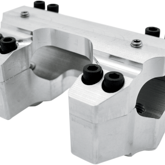 Caracteristicas: Fit under the stock cover Include all necessary installation hardware CNC-machined from 6061-T6 aluminum with a raw finish Tapped for 1/2"-13 riser bolts Top clamp has tapped holes to lock handlebars in place Come with set screws Made in the U.S.A.