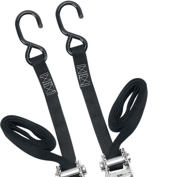Caracteristicas: Intended for middle-weight bikes, snowmobiles, ATVs, PWC and shop equipment Industrial-grade PowerTye ratchet 4,500-lb. test nylon webbing 3/8" heavy-duty vinyl-coated hooks 700-lb. working load Double security stitching Made in the U.S.A.