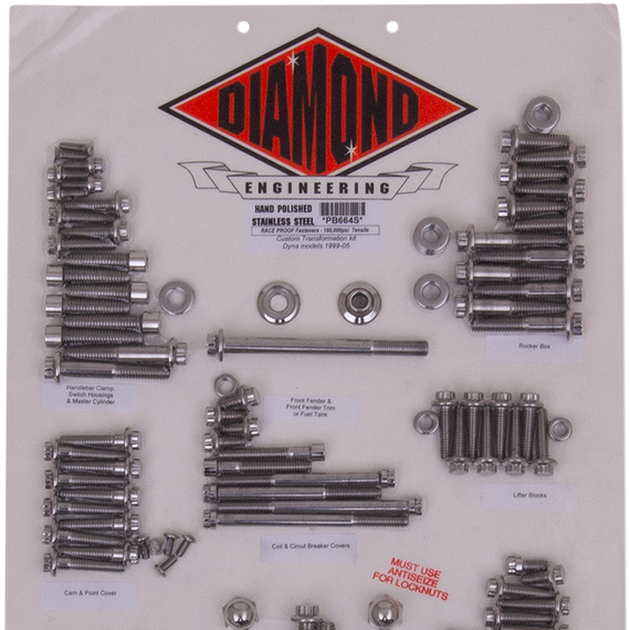 Caracteristicas: Customize a bike without having to completely disassemble it Groups of polished stainless steel fasteners covering the engine, transmission and the most visible areas of the motorcycle Kits add detail and a custom look with ease Kits include fasteners for primary, inspections and inner primary; cam and points; oil pump or oil line cover, filter mount and sensors (Dyna and Twin Cam FLHT) or oil filter plugs and sensors (Softail Twin Cam); lifter blocks; rocker box; coil and circuit breaker covers (Dyna); transmission side cover; oil filler (FLHT models); transmission top cover; handlebar clamp, switch housings and master cylinder; front fender or front fender trim and fuel tank (FLHT models); rear fender rail or swingarm pivot blocks and rear floorboard brackets (FLHT models) Made in the U.S.A.