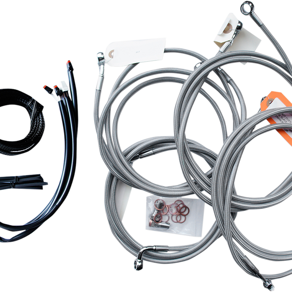 Caracteristicas: Take "cable calculation" headaches out of swapping handlebars Kits give you the correct length cables, brake lines and wire extensions you need so you can complete a handlebar swap Stainless braided kits include throttle cable, idle cable (unless noted), clutch cable, brake lines, chrome "T" brake line junction, banjo bolts, fittings and copper crush washers Made in the U.S.A. Kits are based on using 2" risers with Ape Hanger handlebars