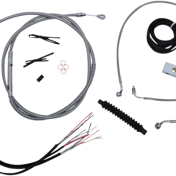 Caracteristicas: Take "cable calculation" headaches out of swapping handlebars Kits give you the correct length cables, brake lines and wire extensions you need so you can complete a handlebar swap Stainless braided kits include throttle cable, idle cable (unless noted), clutch cable, brake lines, chrome "T" brake line junction, banjo bolts, fittings and copper crush washers Made in the U.S.A. Kits are based on using 2" risers with Ape Hanger handlebars