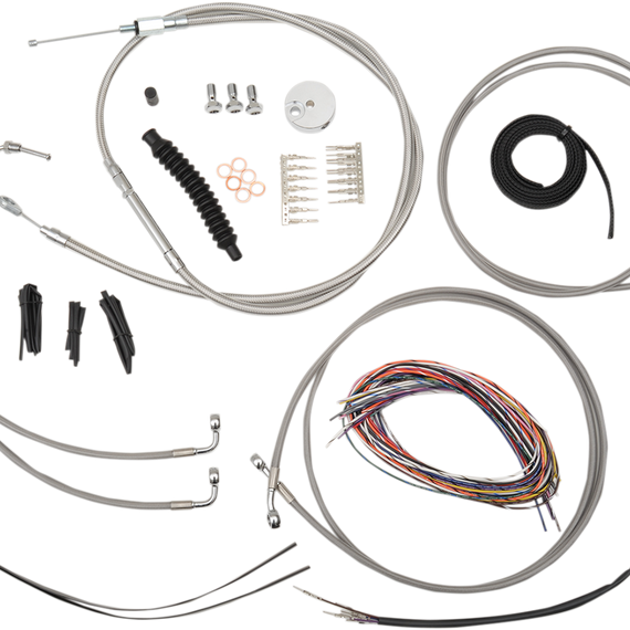 Caracteristicas: Take "cable calculation" headaches out of swapping handlebars Kits give you the correct length cables, brake lines and wire extensions you need so you can complete a handlebar swap Stainless braided kits include throttle cable, idle cable (unless noted), clutch cable, brake lines, chrome "T" brake line junction, banjo bolts, fittings and copper crush washers Made in the U.S.A. Kits are based on using 2" risers with Ape Hanger handlebars