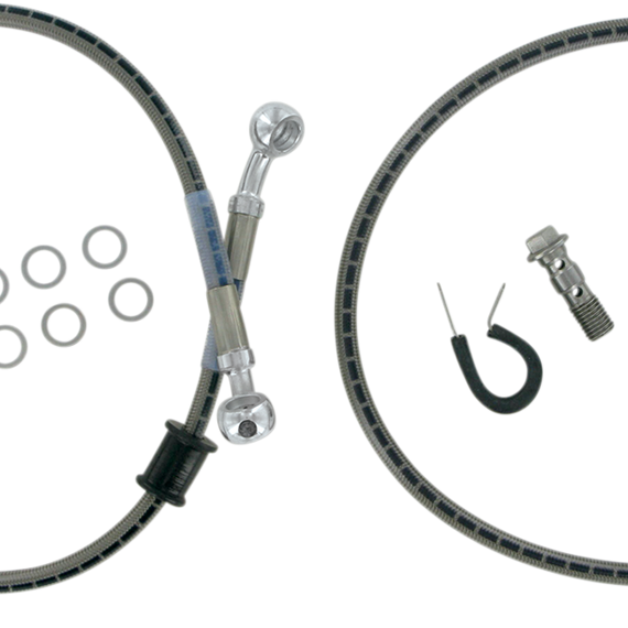 Caracteristicas: Long brake line connects to left caliper while short brake line connects to right caliper Resistance to expansion improves braking power and feel Special two-line configuration direct to master cylinder Lines clear-coated for abrasion protection