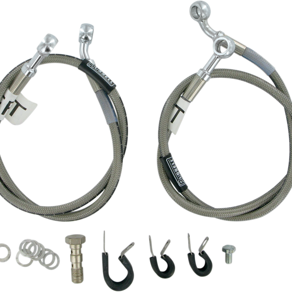 Caracteristicas: Long brake line connects to left caliper while short brake line connects to right caliper Resistance to expansion improves braking power and feel Special two-line configuration direct to master cylinder Lines clear-coated for abrasion protection