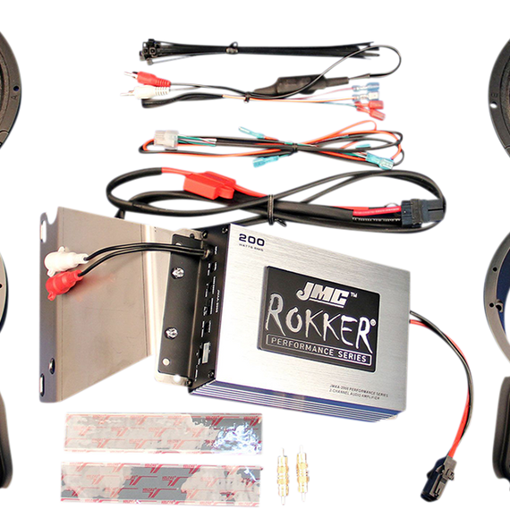 Caracteristicas: ROKKER speakers are spec'd at 2 ohms impedance and 200 watts maximum input (130w RMS - 91db sensitivity), these speakers provide excellent on-highway performance Speaker drivers feature lightweight waterproof woven-fiber cones with super-rigid metal basket and a high-density lite-weight Neodymium magnet structure with integral high-output PEI tweeters Top-quality speaker grills, adapter rings and bracket hardware are included for secure and clean mounting The new ROKKER 2-channel 200w amplifier has been design specifically for use in the fairing with the Harley HK Radio, Harley RSI radio and Jensen, Aquatics or Fosgate replacement HD radios with direct RCA-RCA connections Custom made plug-n-play wiring harnesses/RCA-RCA direct cable adapters are included with this complete audio kit, top quality heavy gauge power/ground wires are used for the fused battery connection, along with all necessary mounting hardware & complete installation/operation instructions Amplifier measures 6-1/2” x 4-3/4“ x 1-3/4”