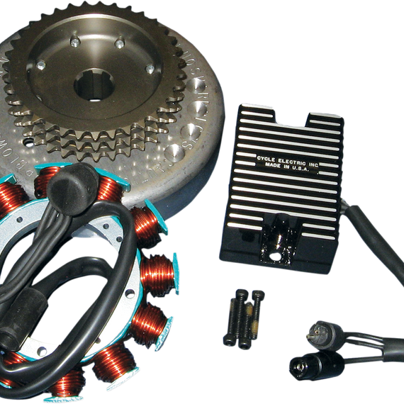 Caracteristicas: Kits include stator, rotor, black rectifying voltage regulator and mounting hardware Made in the U.S.A. Adding electrical accessories increases amperage usage. When doing so, it is important to consider amperage ratings of switches and wires. If you draw too many amps through a switch or wire, it will heat up and may burn. Fuses and breakers are sized to protect wiring and switches. DO NOT CHANGE 30A MAIN BREAKER TO A 50A BREAKER. THE SWITCHES AND WIRING WILL NOT BE PROTECTED.