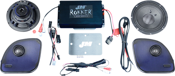 Caracteristicas: Kit includes a full range class D audio amplifier, spec'd at 200watts RMS per channel X2, (400w total) into 2-ohm load @ 14.4vdc with dimensions of 7 ¼" X 4 ¾" X 1 ¾" Amplifier mounts to custom made stainless steel 2-piece bracket system, to provide solid and secure mounting inside the fairing J&M's ROKKER XXR series 6.71" speakers designed as exact size component/replacements for the stock 6.5" Harley fairing speakers Spec'd at 2 ohms impedance and 300 watts maximum input (200w RMS - 91db sensitivity), speakers provide the ultimate in raw audio power and include the new custom grills with built-in high-output tweeters Lightweight waterproof one-piece woven-fiber driver cone with super-rigid metal basket design High-density lite-weight Neodymium magnet structure, specially coated to maintain flux-strength integrity even at extreme operating temperatures High efficiency VENTED voice-coil for improved cooling when operating at high volume levels for extended periods Mounting hole pattern and spade electrical connections are exactly the same as the factory specification, this is a total plug-and-play no-modification solution complete with easy to follow installation instructions Custom made plug-n-play wiring harnesses are included, along with heavy gauge power/ground wires for the fused battery connection, all necessary mounting hardware & complete installation/operation instructions.