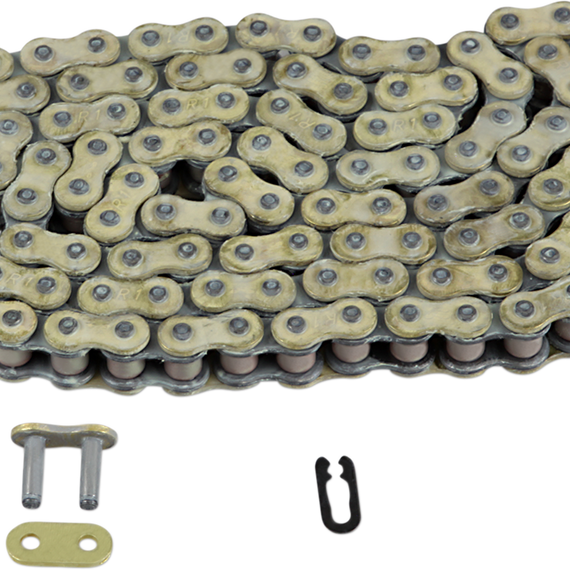Caracteristicas: Designed for high-powered mini racing machines up to 100cc capacity that use 428 non-O-ring chain Shot-peened alloy steel side plates Extended bushings to reduce friction between outer and inner link plates, which maximizes power transmission Ultra-high 4,496 lb. average tensile strength Case-hardened alloy steel bearing pins for maximum resistance to wear Gold-colored side plates help reduce corrosion The perfect match for Renthal sprockets Clip type link included