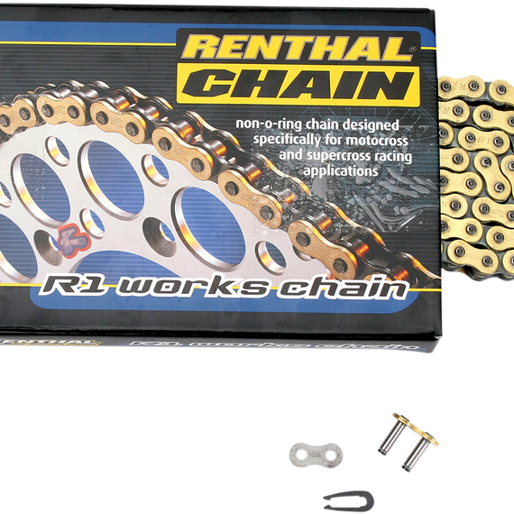 Caracteristicas: Designed for high-powered mini racing machines up to 100cc capacity that use 428 non-O-ring chain Shot-peened alloy steel side plates Extended bushings to reduce friction between outer and inner link plates, which maximizes power transmission Ultra-high 4,496 lb. average tensile strength Case-hardened alloy steel bearing pins for maximum resistance to wear Gold-colored side plates help reduce corrosion The perfect match for Renthal sprockets Clip type link included
