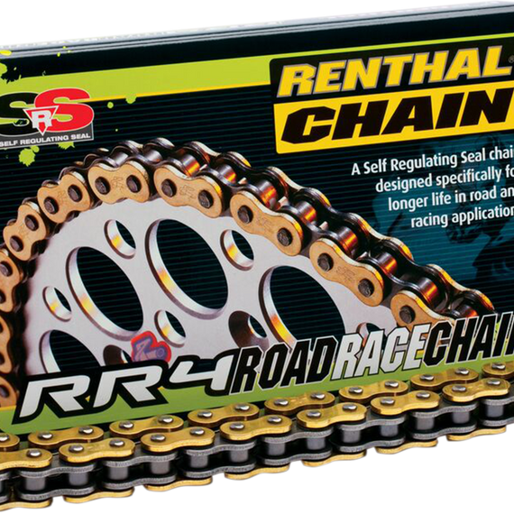 Caracteristicas: Developed exclusively for Superbike racing applications Utilizes Renthal's Self Regulating Seal (SRS) technology to increase the service life of the chain in road applications; also enhances chain flexibility for smoother operation Features high-alloy steel plates and pins, solid bushings and rollers, shot-peened side plates and gold sides Comes pre-stretched for less adjustment during break in Comes with a pair of latex gloves for mess-free installation Available in 520 pitch only, average tensile strength: RR4 SRS 520-8,206 lbs. Rivet only link included
