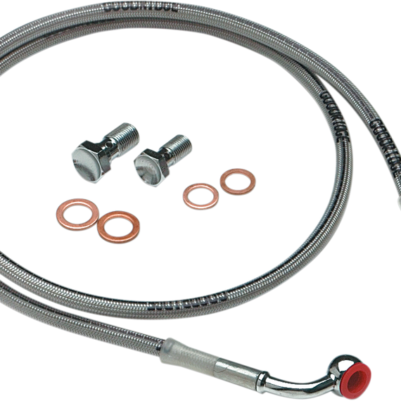 Caracteristicas: Stainless steel braid is superior in pressure rating, flame resistance and volumetric expansion to all other material, including aramid, resulting in unmatched stopping power PTFE liner is an inert material, compatible with all hydraulic and brake fluids; has a heat range of -158°F to 500°F and shields brake systems from moisture, unlike other materials like nylon PVC hose coating adds great looks, abrasion protection to expensive parts, and resistance to damaging UV rays Upper lines run from the ABS controller to the master cylinder Kits include stainless steel braided hose and chrome hardware