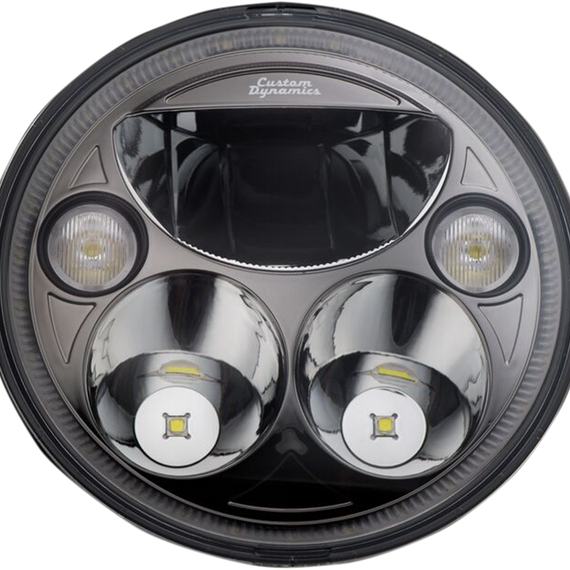 Caracteristicas: Premium 7" Round LED headlamp designed for custom installation on models with factory 7" headlight Complex reflector design features three low beam LEDs and two high beam LEDs with a combination of projector and reflector type LEDs and built in halo ring LED combination provides superior low and high beam outputs Durable polycarbonate lens with H4 connector and mounting hardware included; no additional trim ring needed 4210 raw lumens/2947 effective lumens; 5800K color temp 1.1 amp low current draw, 1.5 amp high current draw, 0.2 amp halo ring current draw