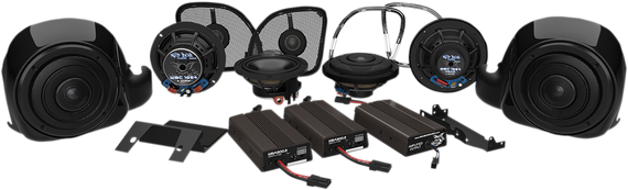 Caracteristicas: Designed to work with factory charging system—no upgrade required Includes fairing speakers, rear speakers, and 6.5” speakers with adaptors for the fairing lower glove boxes Fairing speakers grills include black trim and chrome trim Speaker adaptors for fairing lower glove boxes give simple access to factory coolant tank Main portion of lower speaker adaptor is gloss black to match factory inner fairing Includes Wild Boar Audio WBA 600.4 amp and WBA 300.2 with special mounting plates All amps fit inside fairing ,are bolt in, and 100% plug and play Amplifiers feature R.E.M.I.T Technology for excellent FM Reception from a Class D amp Kit comes complete with all wiring and hardware to complete the installation Note: A Radio Reflash may be required for best performance