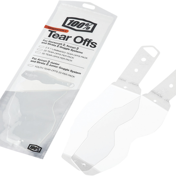 Caracteristicas: Direct replacement tear-offs for 100% Accuri 2, Racecraft 2 and Strata 2 goggles