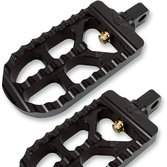 • Give your bike a unique design twist with these all-billet aluminum adjustable serrated footpegs