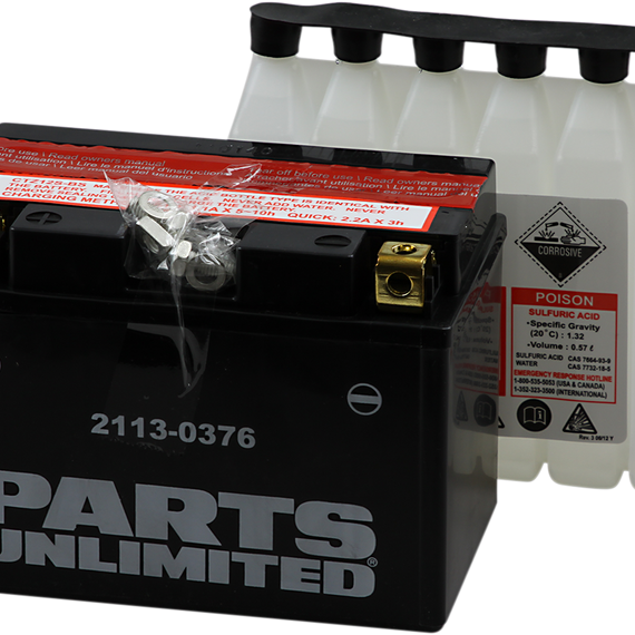 Caracteristicas: Parts Unlimited is proud to offer a premium-quality, maintenance-free battery at a great low price Special absorbed-glass mat battery eliminates water loss, permitting the battery to be permanently sealed once it is filled with acid Holds charge three times longer than conventional batteries High performance active material with anti-sulfation additive High capacity and cranking performance Acid Pack included
