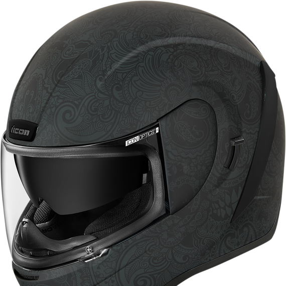 Caracteristicas: Injection molded polycarbonate shell for strength Internal airflow geometry and continuous venting system keep rider cool Fog-free Icon Optics™ shield with Rapid-Release™ system Prolock™ positive shield-locking system TracShield™ shield with tear-off posts available; sold separately Internal Dropshield with exterior switch Comfortable sculpted neck roll Removable molded breath deflector Fully removable Hydradry™ 3-piece moisture wicking liner Internal speaker pockets work with Icon's R.A.U. Bluetooth® device Does not ship with PSC or MFJ certification stickers unless purchased from an authorized dealer in that country The Dropshield™ visor must only be used while the main face shield is in the fully closed position